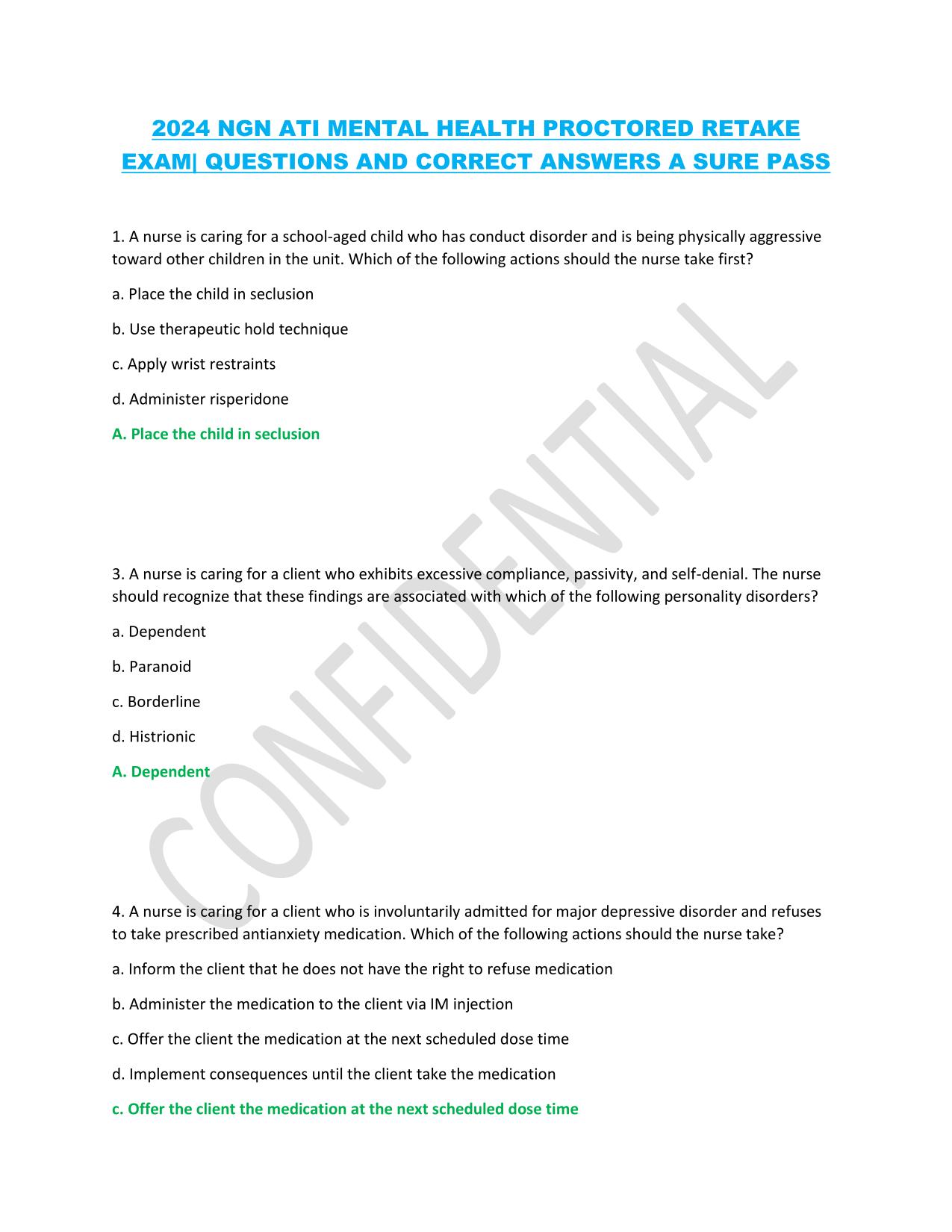 | Tags: | 2025/2026 NGN ATI MENTAL HEALTH PROCTORED RETAKE EXAM UPDATED 1. A nurse is caring for a school-aged child who has conduct disorder and is being physically aggressive toward other children in the unit. Which of the following actions should the nurse take first? a. Place the child in seclusion b. Use therapeutic hold technique c. Apply wrist restraints d. Administer risperidone A. Place the child in seclusion 3. A nurse is caring for a client who exhibits excessive compliance, passivity, and self-denial. The nurse should recognize that these findings are associated with which of the following personality disorders? a. Dependent b. Paranoid c. Borderline d. Histrionic A. Dependent 4. A nurse is caring for a client who is involuntarily admitted for major depressive disorder and refuses to take prescribed antianxiety medication. Which of the following actions should the nurse take? a. Inform the client that he does not have the right to refuse medication b. Administer the medication to the client via IM injection c. Offer the client the medication at the next scheduled dose time d. Implement consequences until the client take the medication c. Offer the client the medication at the next scheduled dose time |