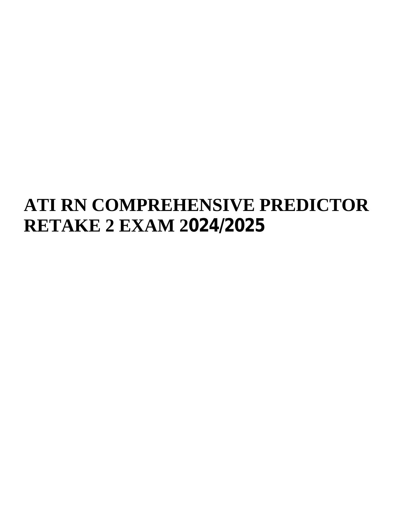 ATI RN COMPREHENSIVE PREDICTOR RETAKE 2 EXAM 2024/2025 1. A nurse is assessing a client who has received an antibiotic. The nurse should identify which of the following findings as an indication of a possible allergic reaction to the medication? A. Bradycardia B. Headache C. Joint pain D. Hypotension 2. A nurse on a mental health unit is caring for a client who has schizophrenia and is experiencing auditory hallucinations telling them to hurt others. The client is refusing to take anti-psychotic medication. Which of the following responses should the nurse make? A. “You should plan to take this medication for a few weeks.” B. “You will regret it if you do not take this medication.” C. “This medication will help you respond to the voices. D. “This medication will help you stop the voices you are hearing.” 3. A nurse is providing care for a patient who has depression and is to have electroconvulsive therapy. Which of the following conditions should the nurse identify as increasing the client’s risk for complications? A. Hyperthyroidism B. Renal calculi C. Diabetes mellitus D. Cardiac dysrhythmias 4. A nurse is reviewing the laboratory results of a client who has rheumatoid arthritis. Which of the following findings should the nurse report to the provider? A. WBC count 8,000/mm B. Platelets 150,000/mm C. Aspartate aminotransferase 10 units/L D. Erythrocyte sedimentation 75 mm/hr 5. A nurse is suctioning the airway of a client who is receiving mechanical ventilation via an endotracheal tube. Which of the following findings should the nurse identify as an indication that suctioning has been effective? A. Presence of a productive cough B. Decreased peak inspiratory pressure C. Thinning of mucous secretions D. Flattening of the artificial airway cuff 6. A nurse is caring for a client who is in a seclusion room following violent behavior. The client continues to display aggressive behavior. Which of the following actions should the nurse take? A. Stand within 30cm (1 ft) of the client when speaking with them. B. Express sympathy for the client’s situation. C. Confront the client about his behavior. D. Speak assertively to the client. 7. A nurse is caring for a client who is immediately postoperative following an adrenalectomy to treat Cushing’s disease. Which of the following actions is the nurse’s priority? A. Reposition the client for comfort every 2 hours B. Observe for any indications of infection C. Document amount and color of the incisional drainage D. Monitor the client’s fluid and electrolyte status. 8. A nurse is caring for a client who is scheduled for a surgical procedure and states, “I don’t want to have this surgery anymore.” Which of the following responses should the nurse make? A. “We can manage your care following the procedure without complications.” B. “You have the right to refuse the procedure.” C. “Your doctor thinks the surgery is necessary.” D. “Let me review the procedure so you can understand what is going to happen.” 9. A nurse is evaluating a client who has borderline personality disorder. Which of the following behaviors indicates an improvement in the client’s condition? A. Impulsive behaviors