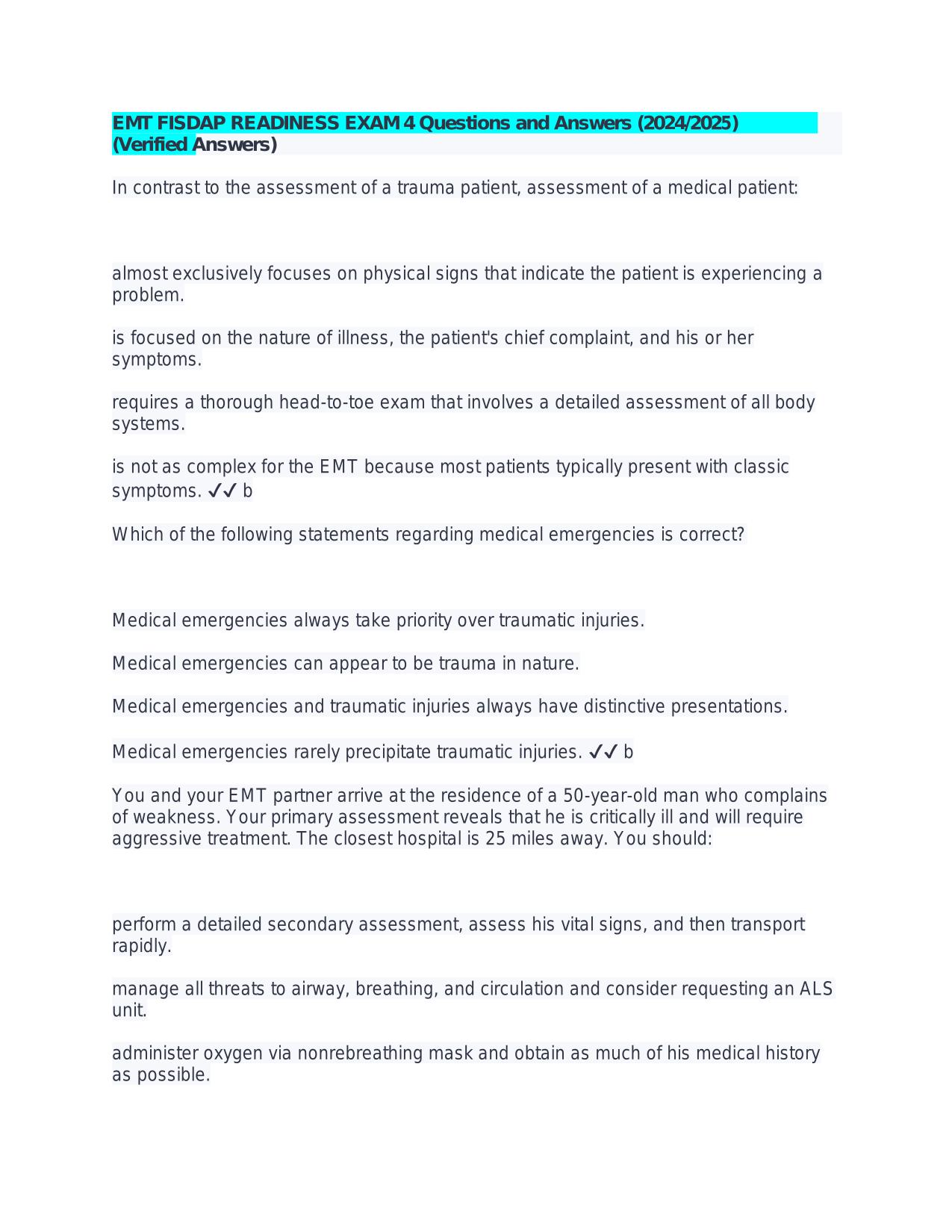 | Tags: | EMT FISDAP READINESS EXAM 4 Questions and Answers (2024/2025) (Verified Answers) In contrast to the assessment of a trauma patient, assessment of a medical patient: almost exclusively focuses on physical signs that indicate the patient is experiencing a problem. is focused on the nature of illness, the patient's chief complaint, and his or her symptoms. requires a thorough head-to-toe exam that involves a detailed assessment of all body systems. is not as complex for the EMT because most patients typically present with classic symptoms. ✔✔ b Which of the following statements regarding medical emergencies is correct? Medical emergencies always take priority over traumatic injuries. Medical emergencies can appear to be trauma in nature. Medical emergencies and traumatic injuries always have distinctive presentations. Medical emergencies rarely precipitate traumatic injuries. ✔✔ b You and your EMT partner arrive at the residence of a 50-year-old man who complains of weakness. Your primary assessment reveals that he is critically ill and will require aggressive treatment. The closest hospital is 25 miles away. You should: perform a detailed secondary assessment, assess his vital signs, and then transport rapidly. manage all threats to airway, breathing, and circulation and consider requesting an ALS unit. administer oxygen via nonrebreathing mask and obtain as much of his medical his |