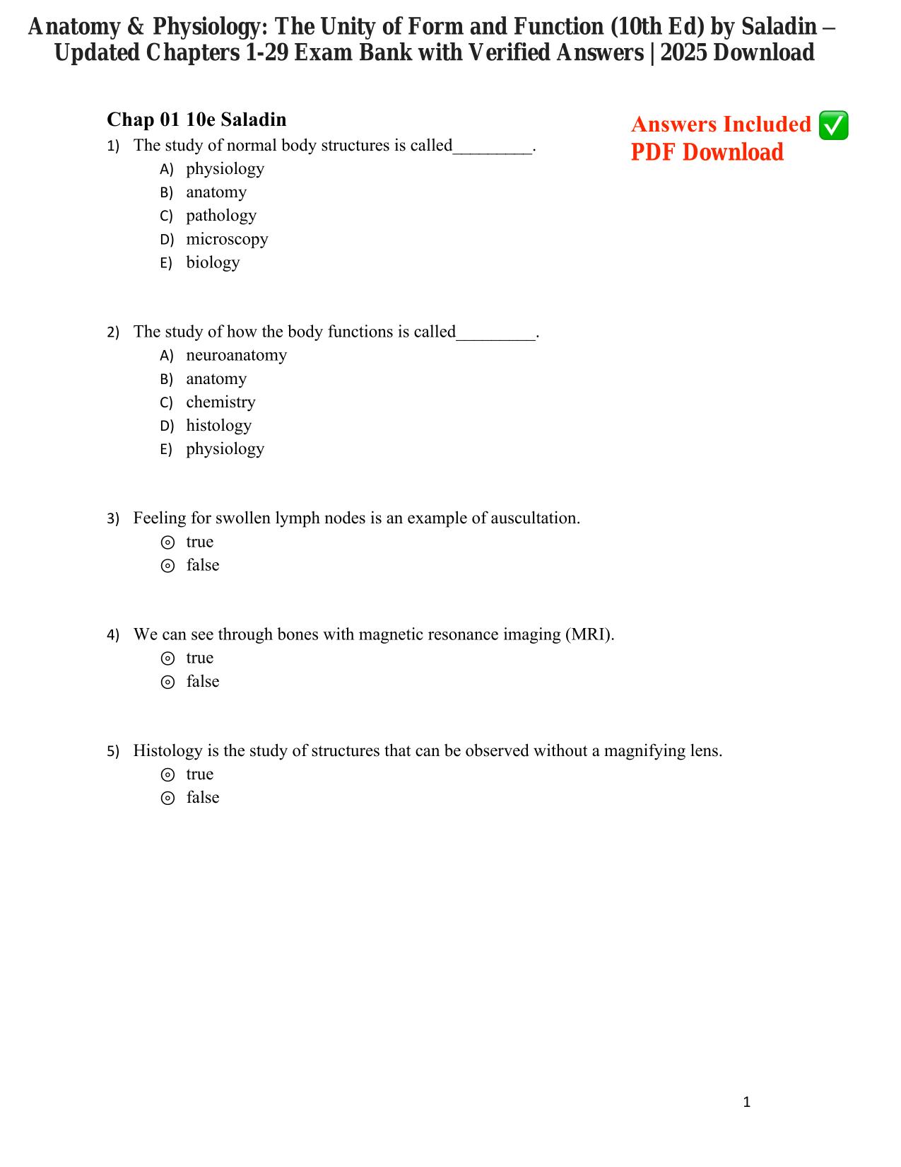 Anatomy & Physiology: The Unity of Form and Function (10th Ed) by Saladin – Updated Chapters 1-29 Exam Bank with Verified Answers | 2025 Download Chap 01 10e Saladin 1) The study of normal body structures is called_________. A) physiology B) anatomy C) pathology D) microscopy E) biology Answers Included PDF Download✅ 2) The study of how the body functions is called_________. A) neuroanatomy B) anatomy C) chemistry D) histology E) physiology 3) Feeling for swollen lymph nodes is an example of auscultation. ⊚ true ⊚ false 4) We can see through bones with magnetic resonance imaging (MRI). ⊚ true ⊚ false 5) Histology is the study of structures that can be observed without a magnifying lens. ⊚ true ⊚ false 1 6) Feeling structures with your fingertips is called_________, whereas tapping on the body and listening for sounds of abnormalities is called_________. A) palpation; auscultation B) auscultation; percussion C) percussion; auscultation D) palpation; percussion E) percussion; palpation 7) Which of these is the best imaging technique for routinely examining the anatomical development of a fetus? A) Auscultation B) PET scan C) MRI D) Sonography E) Radiography 8) The study of the structure and function of cells is called_________. A) cytology B) gross anatomy C) exploratory physiology D) comparative physiology E) radiology 9) Ultrastructure refers to the detailed structure to the level of the _________. A) molecule B) cell C) organelle D) tissue E) organ 2 10) The study of how hormones function is called_________. A) neuroanatomy B) neurophysiology C) endocrinology D) histology E) pathophysiology 11) The study of mechanism of disease is called_________. A) neuroanatomy B) neurophysiology C) endocrinology D) histology E) pathophysiology 12) The terms physics, physiology, and physician come from a term_________ proposed to distinguish natural causes from supernatural causes. A) Hippocrates B) Plato C) Schwann D) Aristotle E) Avicenna 13) Who was a physician to the Roman gladiators, learned by dissection of animals, and saw science as a method of discovery? A) Hippocrates B) Plato C) Schwann D) Aristotle E) Galen 14) Cells were first named by microscopist Robert Hooke. ⊚ true ⊚ false 3 15) All functions of the body can be interpreted as the effects of cellular activity. ⊚ true ⊚ false 16) Known as "the father of modern anatomy,"_________ was the first to publish accurate drawings of the body. A) Vesalius B) Maimonides C) Harvey D) Aristotle E) van Leeuwenhoek 17) The most influential medical textbook of the ancient era was written by_________. A) Hippocrates B) Aristotle C) Galen D) Vesalius E) Avicenna 18) Who established a code of ethics for physicians and is considered the "father of medicine"? A) Aristotle B) Hippocrates C) Galen D) Vesalius E) Hooke 19) The hypothetico-deductive method is common in physiology, whereas the inductive method is common in anatomy. ⊚ true ⊚ false 4